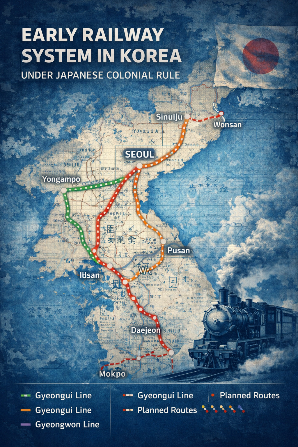 이 시기의 대표 사례로는 경인선(항만 연결), 경부선(종단 간선), 군수 물자 수송 중심 설계, 일본 본토와의 해상 연계, 행정 통제 강화 목적 등이 있습니다. 철도는 ‘이동 수단’ 이전에 ‘지배 수단’이었습니다.